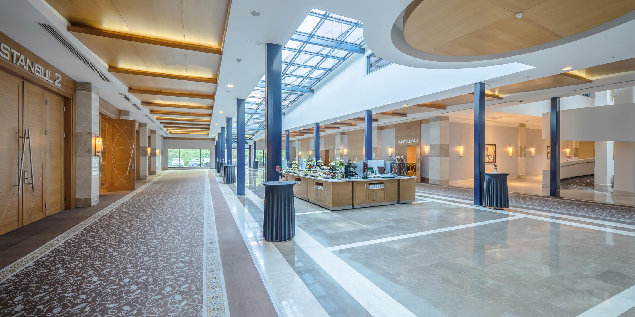 3600 m²'lik gün ışığı alan fuaye alanı, iki geniş kata bölünerek tasarlanmıştır. Üst fuaye alanı ile alt fuaye alanı; yürüyen merdivenler, asansörler ve yürüme yolları aracılığıyla birbirine bağlanır. 3.000 kişilik resepsiyona kadar hizmet veren alan, etkili navigasyonu ile konukların her biri için hızlı ve kolay bir deneyim sunar.